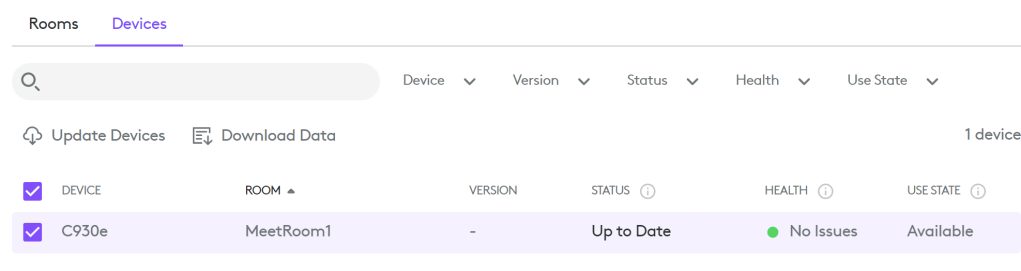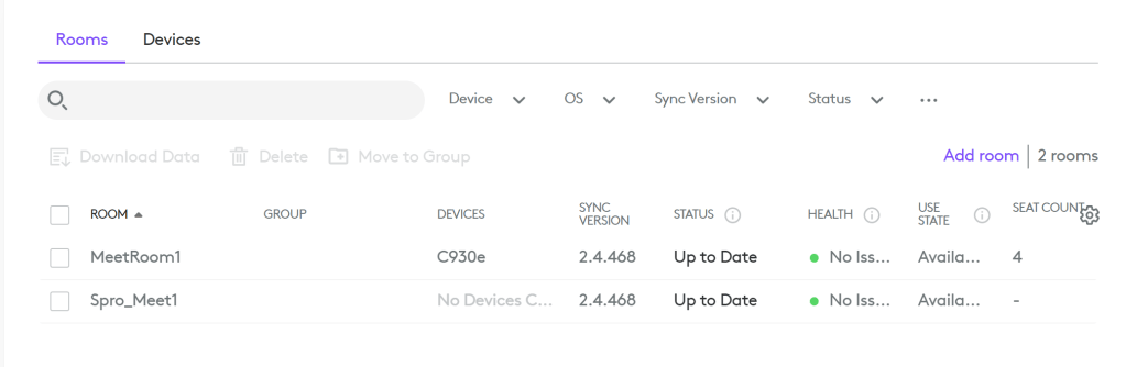 And further moving into the inventory we can see all the available connected devices with the Room name, Group can be defined, connected external Peripherals, Sync version, status, health , Use state and seat count can be defined.
