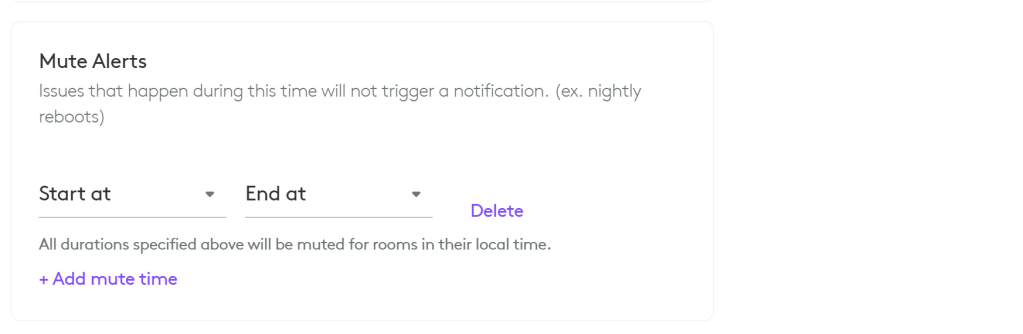 There is also option to mute alerts which is of great help because as we all know the meeting room devices performs a nightly reboot for windows and Teams App update. So we can set the option mute alerts only during that time.