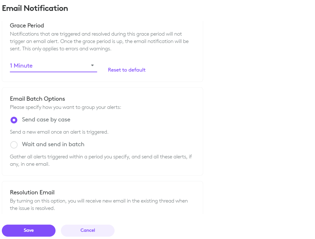 And at last we have an option to set grace period during when if the issue occurs the alerts are not triggered. There is also an option to send email case by case or send them in batches.