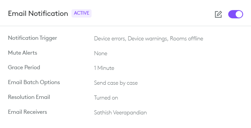 In the email notification we have option to trigger alerts when the device is in a error state, warnings, rooms going offline and if there are any occupancy limit alerts.