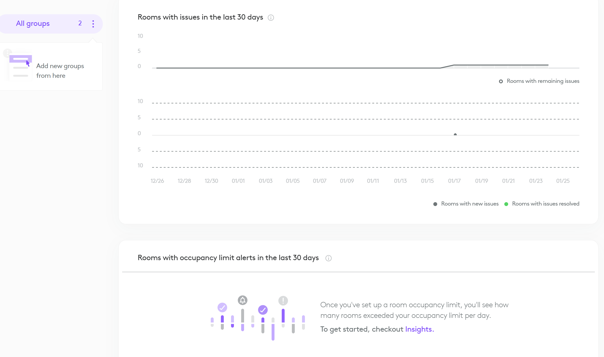 Scrolling down further provides us more useful information on Meeting room with issues for the past 30 days, rooms with occupancy limit alerts in the last 30 days.