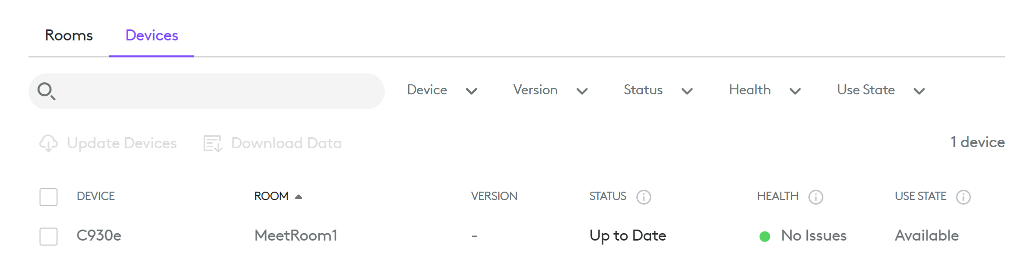 And further moving into the inventory we can see all the available connected devices with the Room name, Group can be defined, connected external Peripherals, Sync version, status, health , Use state and seat count can be defined.