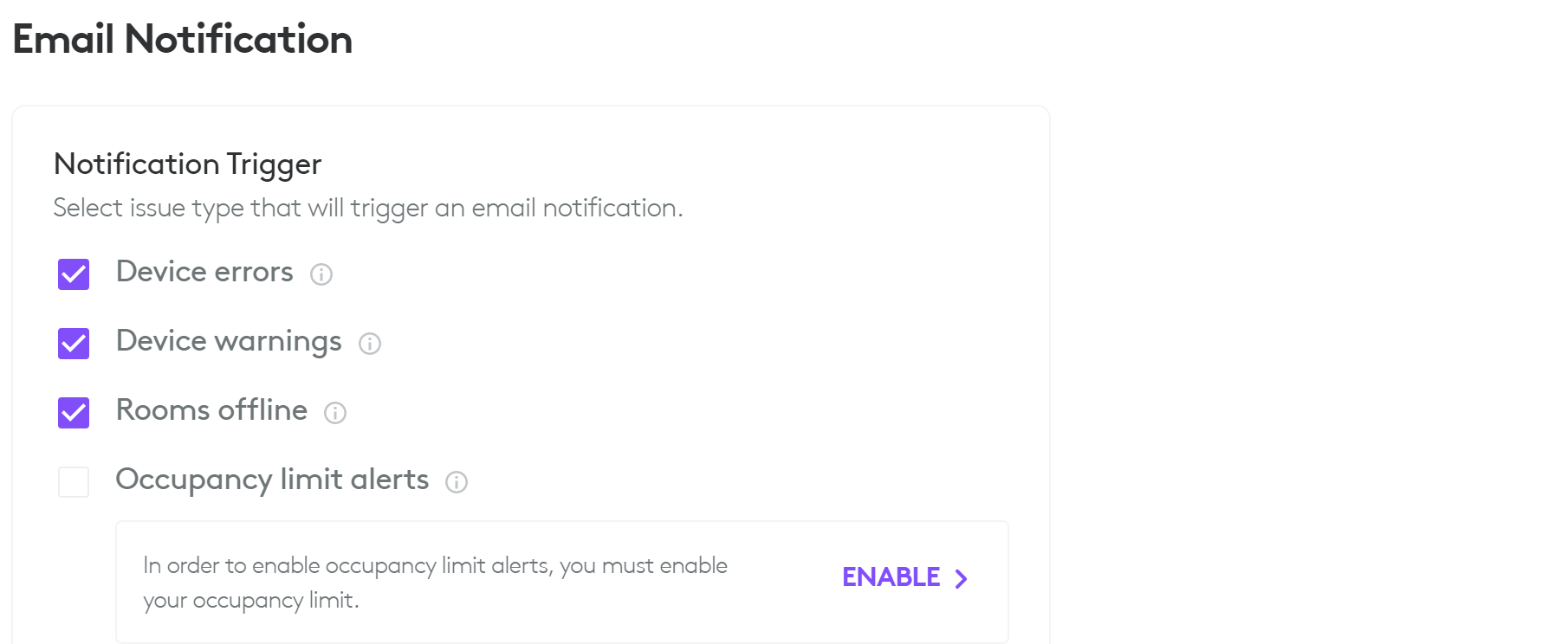 In the email notification we have option to trigger alerts when the device is in a error state, warnings, rooms going offline and if there are any occupancy limit alerts.