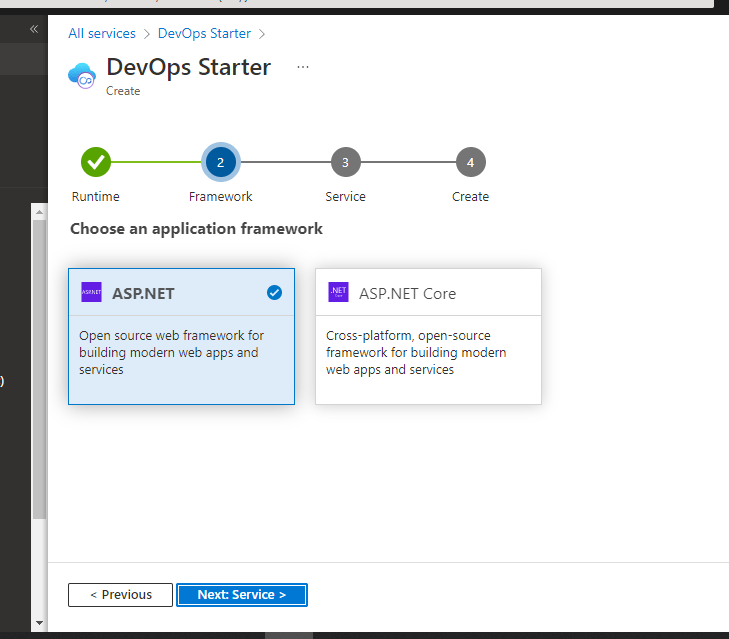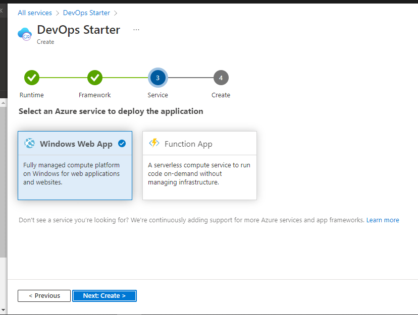 In the next screen we are presented with the option about what language we will be using to create this project. In our below example we are going to use .net to create this new web app.Note if we have our own code then there is an option to choose that and point them to our own Repo.