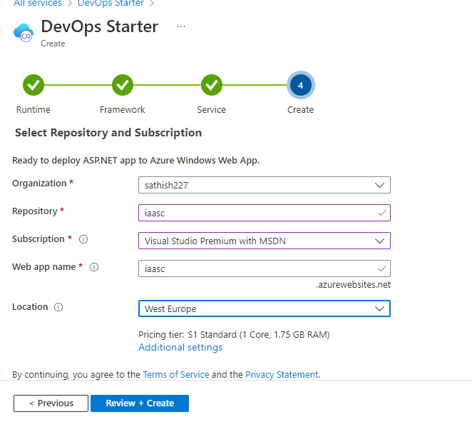 And here we will be presented to choose the repository and the Subscription. This is the place where the continuous delivery pipeline will be setup. By default it chooses the standard S1 pricing tier.