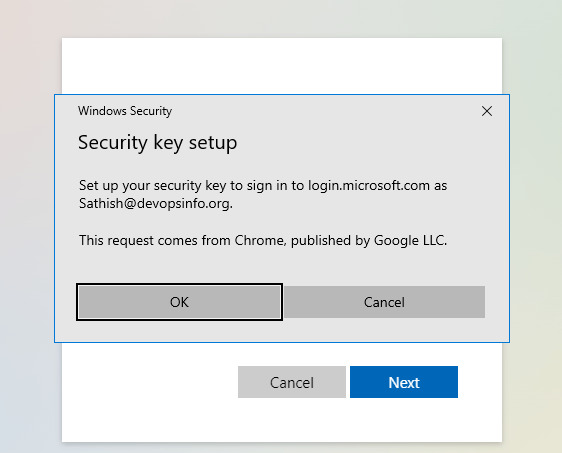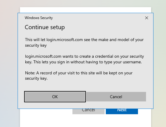 In the next step we could see that it provides us the information that Microsoft will validate the make and model of our security key. This is to make sure the security key is in their supported list and post validating that it creates a credential which will allow to sign in without typing username.