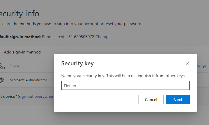 As a last step we will be prompted to enter the name for this key for our verification on our portal when we sign in to mysignins.microsoft.com