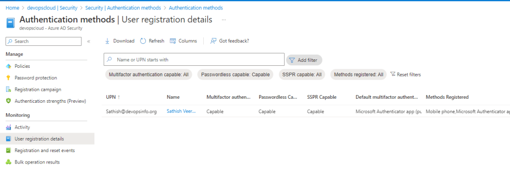 Now we have successfully setup the Passwordless method for this account. How do we verify this well from the admin side yes we have the option to validate this from the use registration details part on the Authentication methods section.