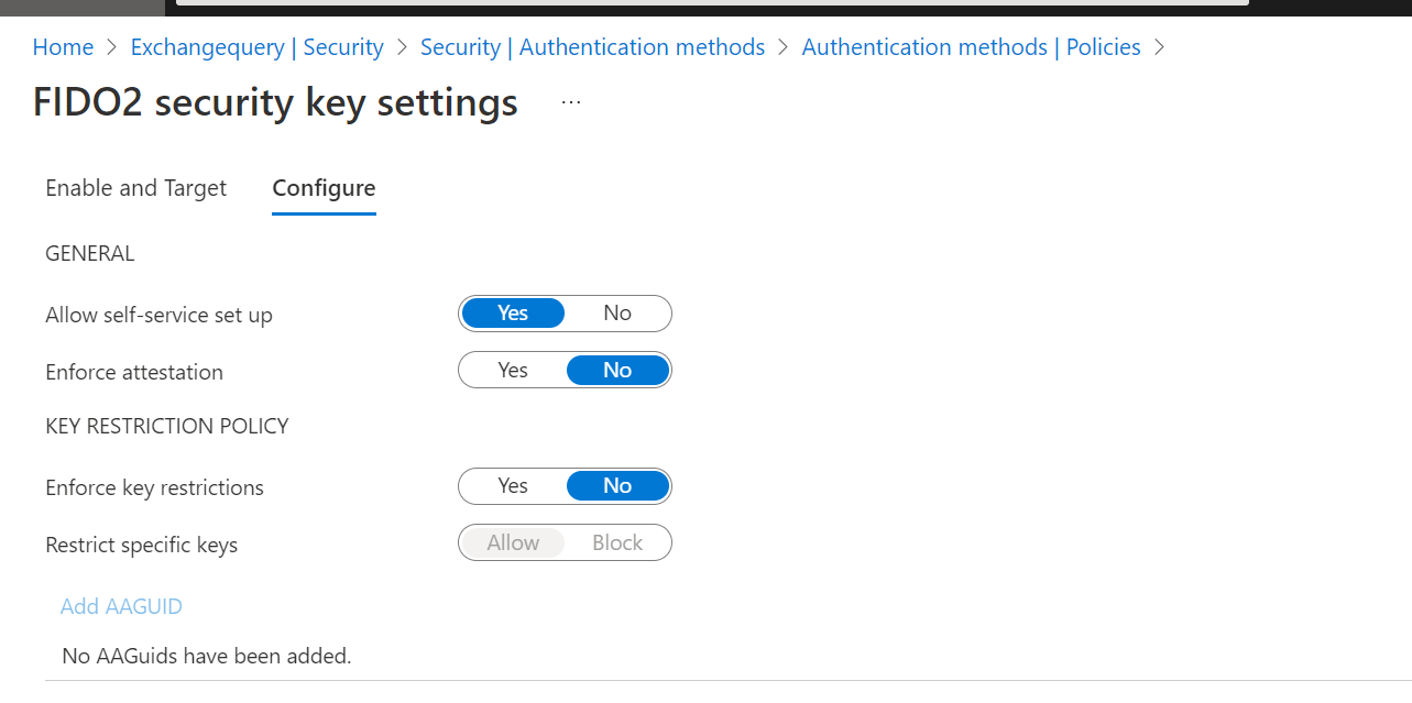 Allow self-service set up should remain set to Yes. If set to no, your users won’t be able to register a FIDO key through the MySecurityInfo portal, even if enabled by Authentication Methods policy.