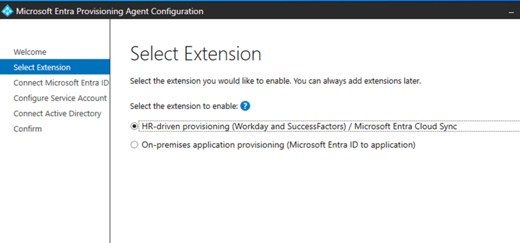 On the Select Extension screen, select HR-driven provisioning (Workday and SuccessFactors) / Microsoft Entra Connect cloud sync and click Next. I believe the option 2 is for a sync from Entra ID to an On premise Application
