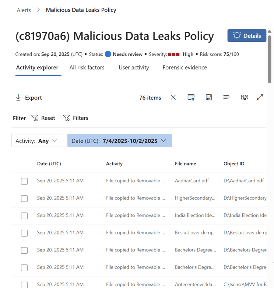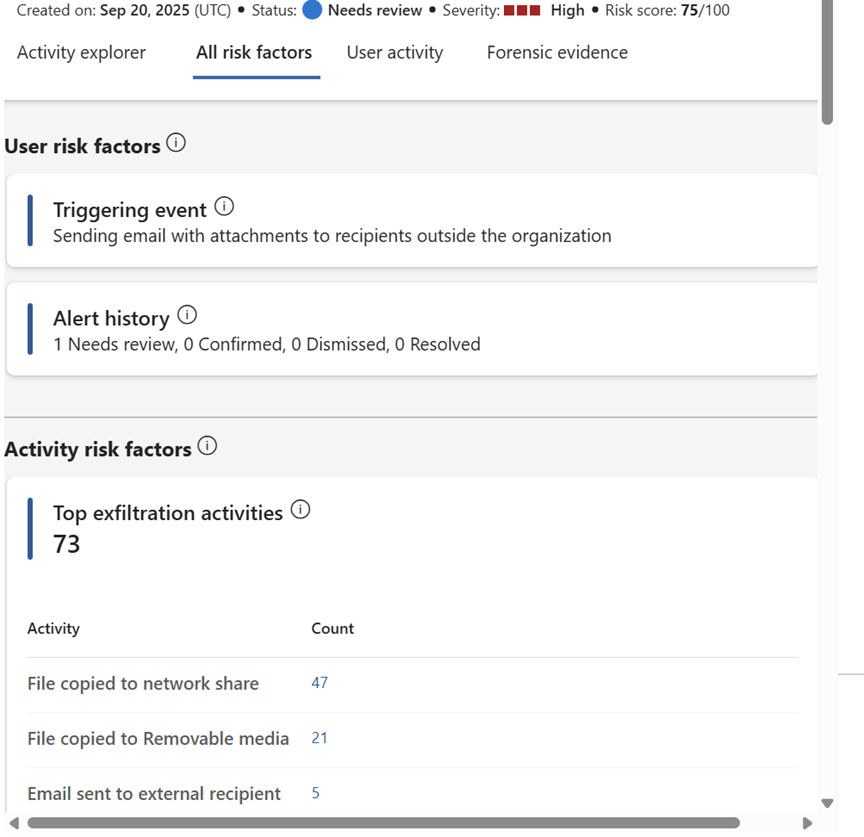 Risk Factors helps us to determine how risky the user activity is based on the alerts generated. It also includes activities like unallowed domains, cumulative exfiltration and more