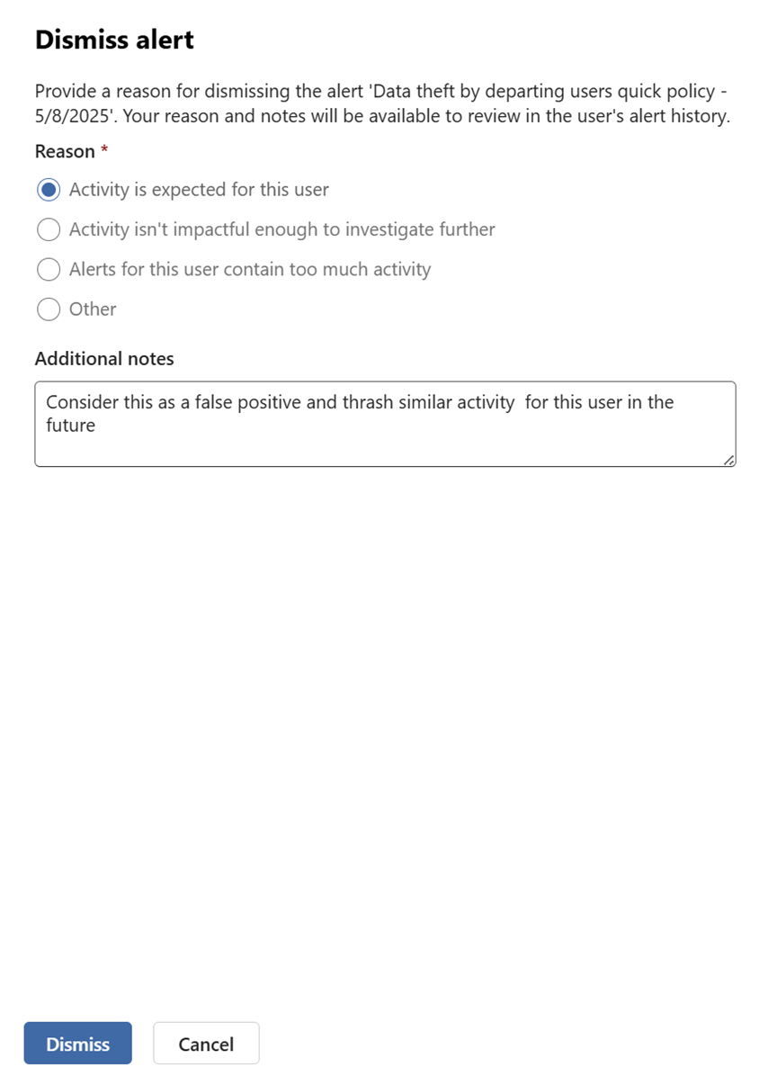 In the dismiss alert we have the option to justify the reason to dismiss the alert. Providing additional notes is very important for feedback