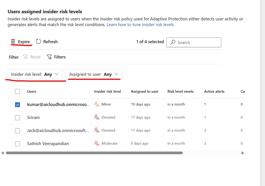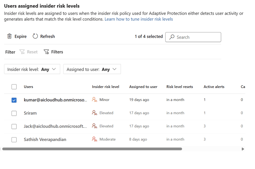 Clicking on “Users assigned insider risk levels” opens a detailed list of users flagged with elevated risk. This is where the investigation begins.
