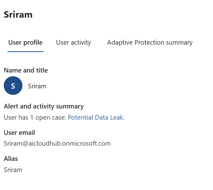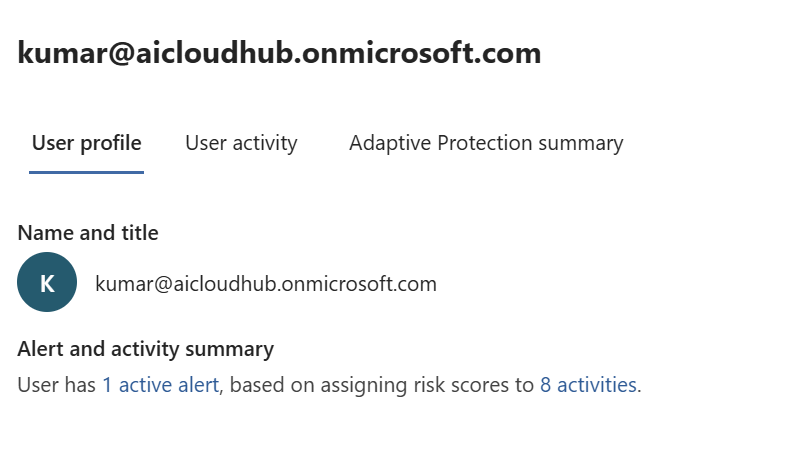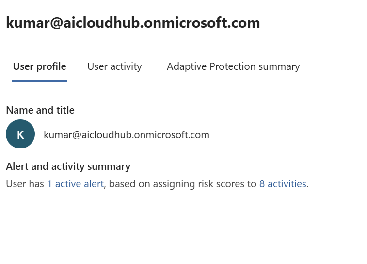The Adaptive Protection dashboard is the SOC team’s starting point. It provides a bird’s-eye view of user risk levels across the organization, helping analysts prioritize investigations.