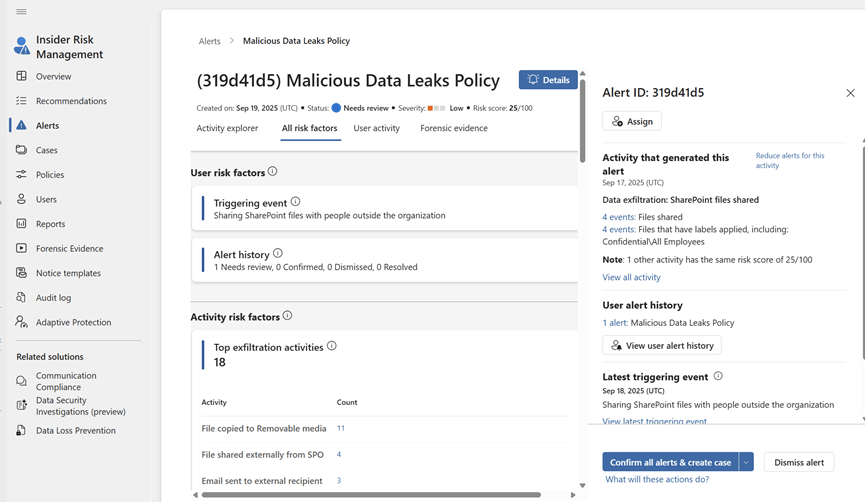 Microsoft Purview Adaptive Protection empowers SOC teams with context rich, behavior driven insights to detect and respond to insider threats. By combining risk scoring, activity tracking, and policy enforcement, SOC teams can: