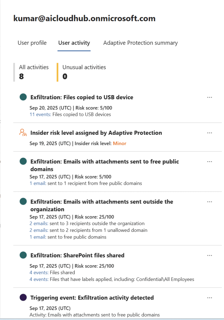 This tab provides a granular view of the user’s actions across Microsoft 365 and other integrated platforms.