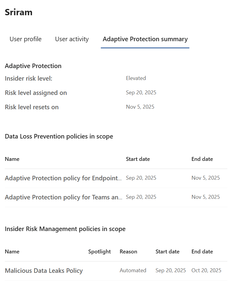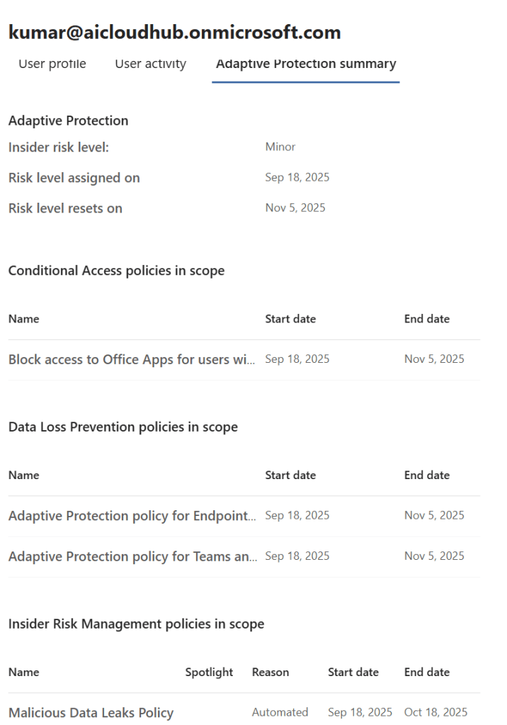 The Adaptive Protection Summary tab shows the user’s risk level increased since when the Risk level was assigned, associated DLP and IRM policies in Scope