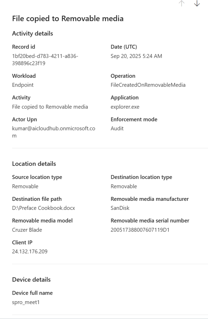- File downloads, email forwarding, USB usage, external sharing, etc.