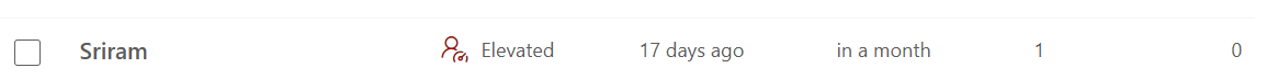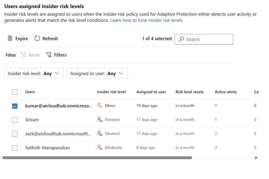 Clicking on “Users assigned insider risk levels” opens a detailed list of users flagged with elevated risk. This is where the investigation begins.