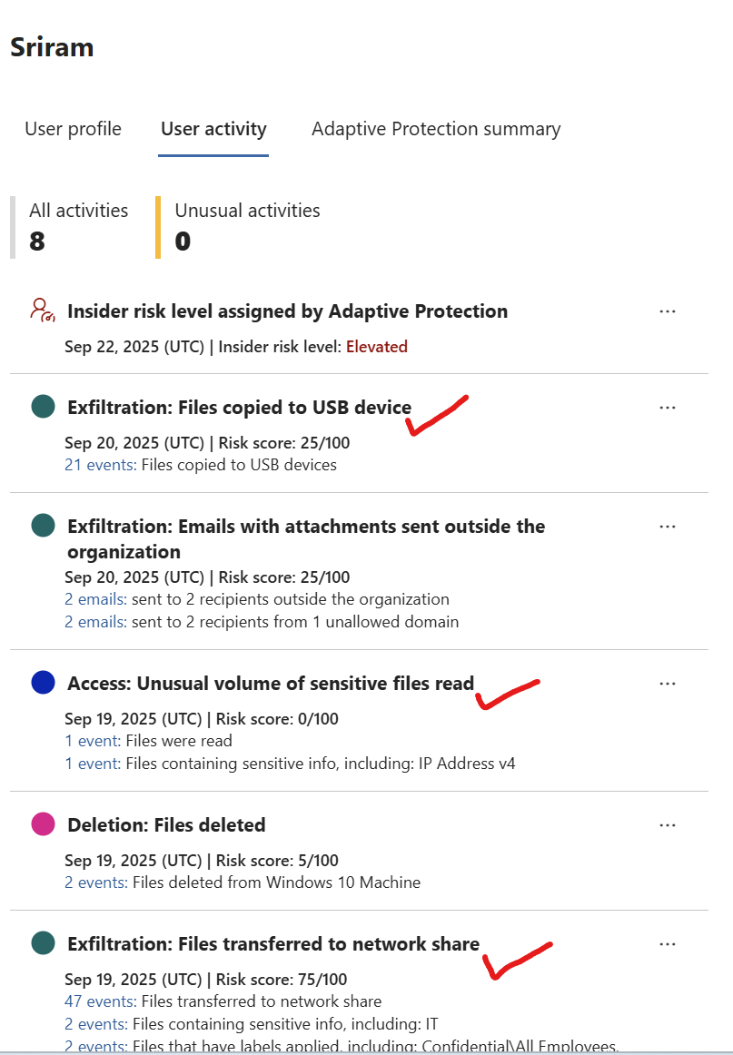 This tab provides a granular view of the user’s actions across Microsoft 365 and other integrated platforms.