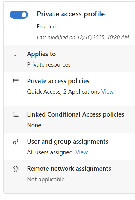 - Go to Global Secure Access → Connect → Traffic forwarding → Private access profile.