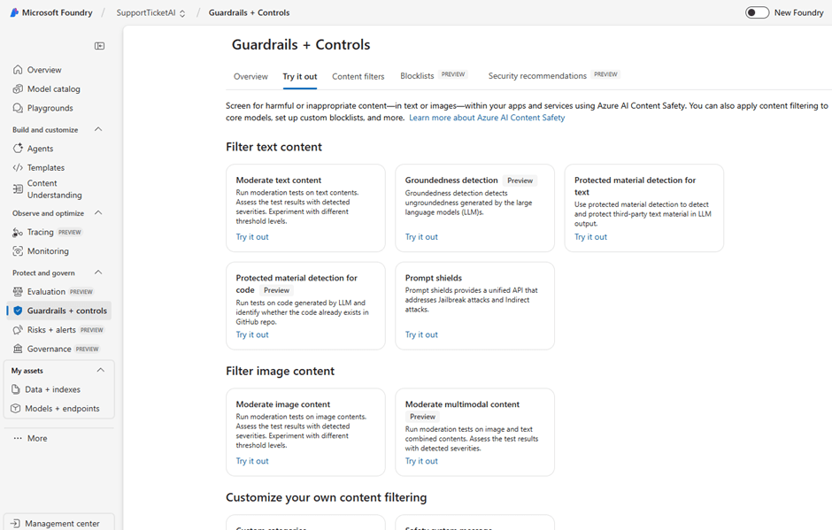 The Try it out tab lets you quickly test prompts, responses, and media against Foundry’s safety models before you enforce rules across apps.