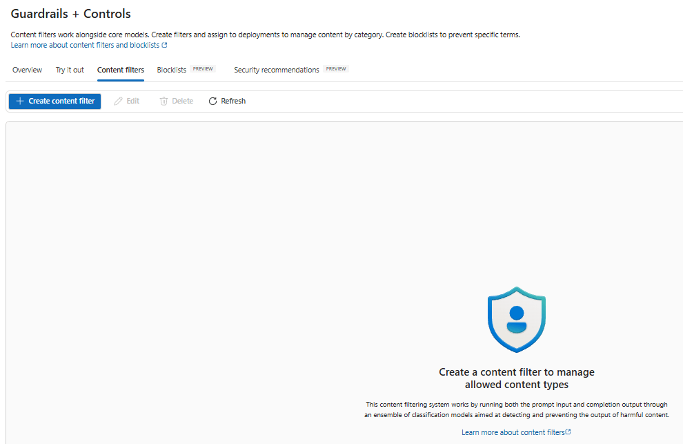 Content filters let you define allowed/blocked categories and assign policies to deployments (models, agents, or endpoints). This is how you enforce moderation on both inputs and outputs.