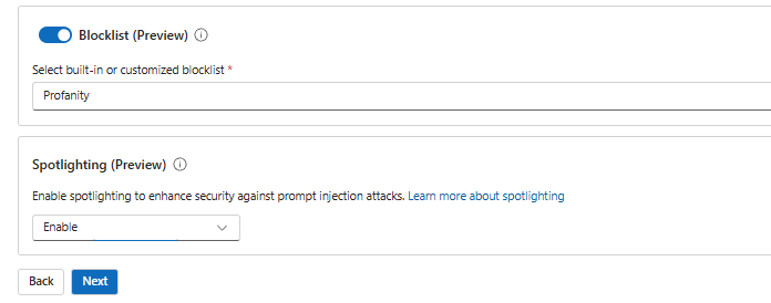 The block list and spotlighting are best options that can be enabled and will be much helpful. Will be GA in the future and can be utilized in the production.