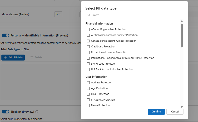 We have the similar capabilities in the output filter, for instance we do have option to set filters for Personally Identifiable Information which is in preview at the moment.