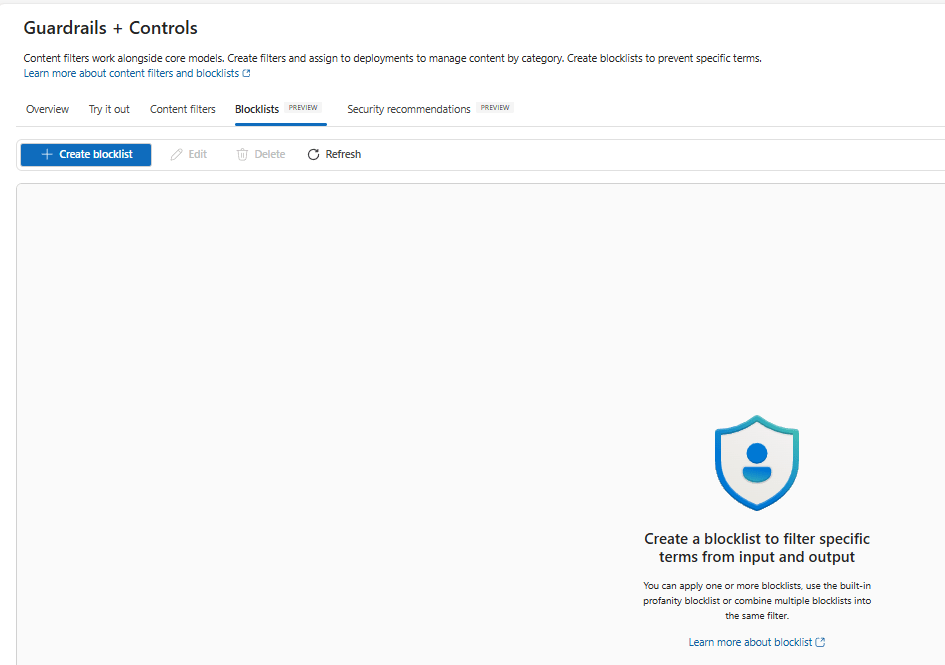 - Go to Guardrails & controls → Blocklists.