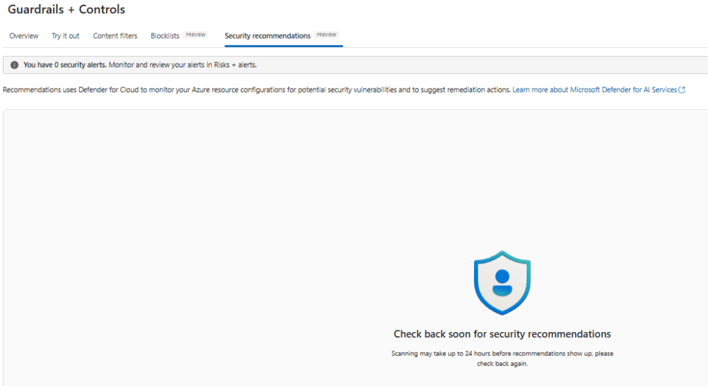 Security is more than content: Foundry integrates with Microsoft Defender for Cloud to surface security recommendations and alerts for your AI resources.