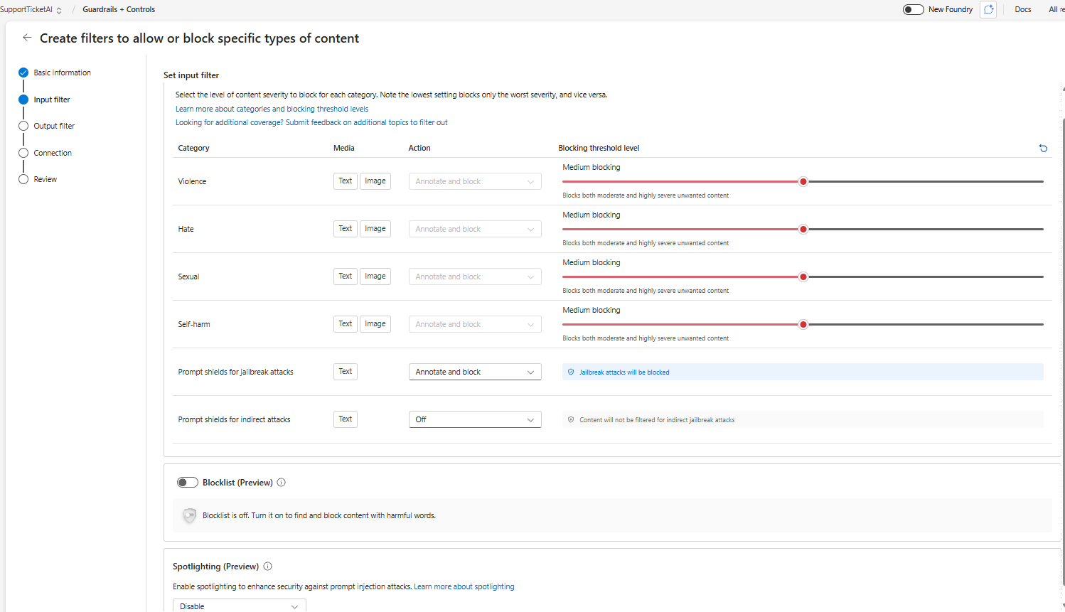 Content filters let you define allowed/blocked categories and assign policies to deployments (models, agents, or endpoints). This is how you enforce moderation on both inputs and outputs.