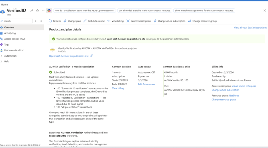 A valid Azure subscription is required. This allows Verified ID resources to be provisioned automatically within your tenant. - Microsoft Entra Permissions
