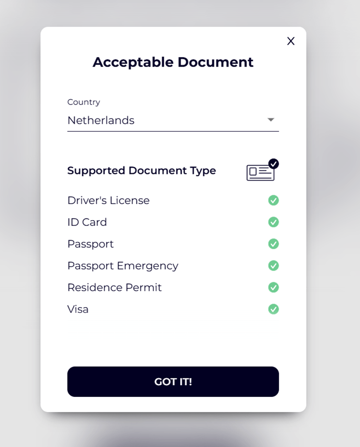 The acceptable documents are listed based on the issuance of the documents from that country