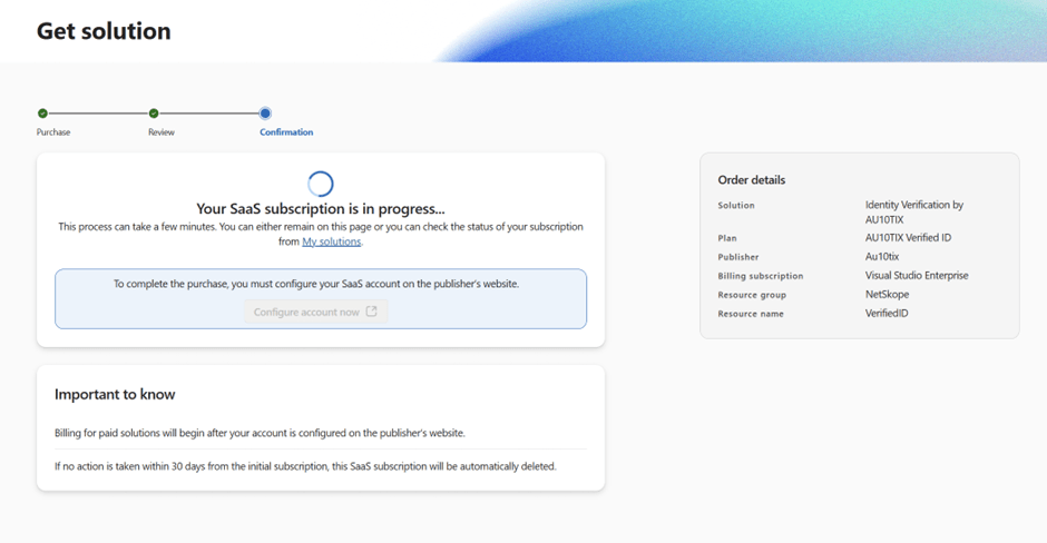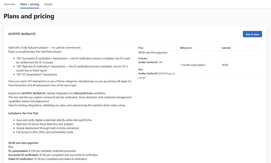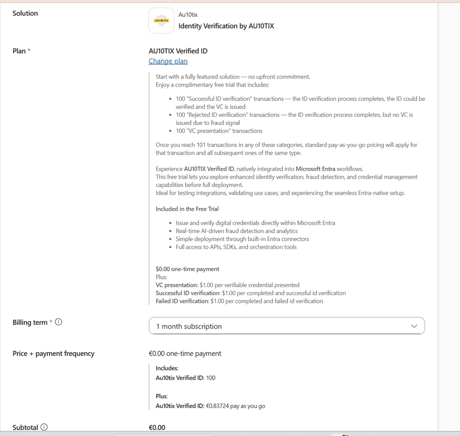 You must choose and activate at least one Verified ID partner—in this case, AU10TIX—and start their 1 month trial subscription.