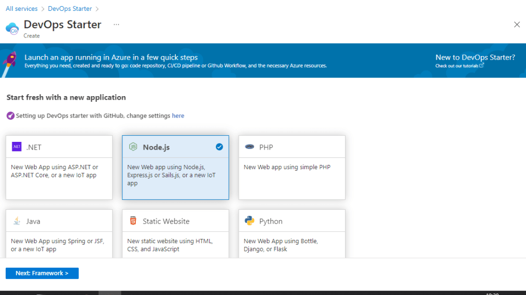 In the next screen we are presented with the option about what language we will be using to create this project. In our below example we are going to use .net to create this new web app.Note if we have our own code then there is an option to choose that and point them to our own Repo.