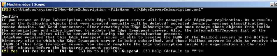 New-EdgeSubscription -FileData ([byte[]]$(Get-Content -Path “C:\EdgeServerSubscription.xml” -Encoding Byte -ReadCount 0)) -Site “Default-First-Site-Name”
