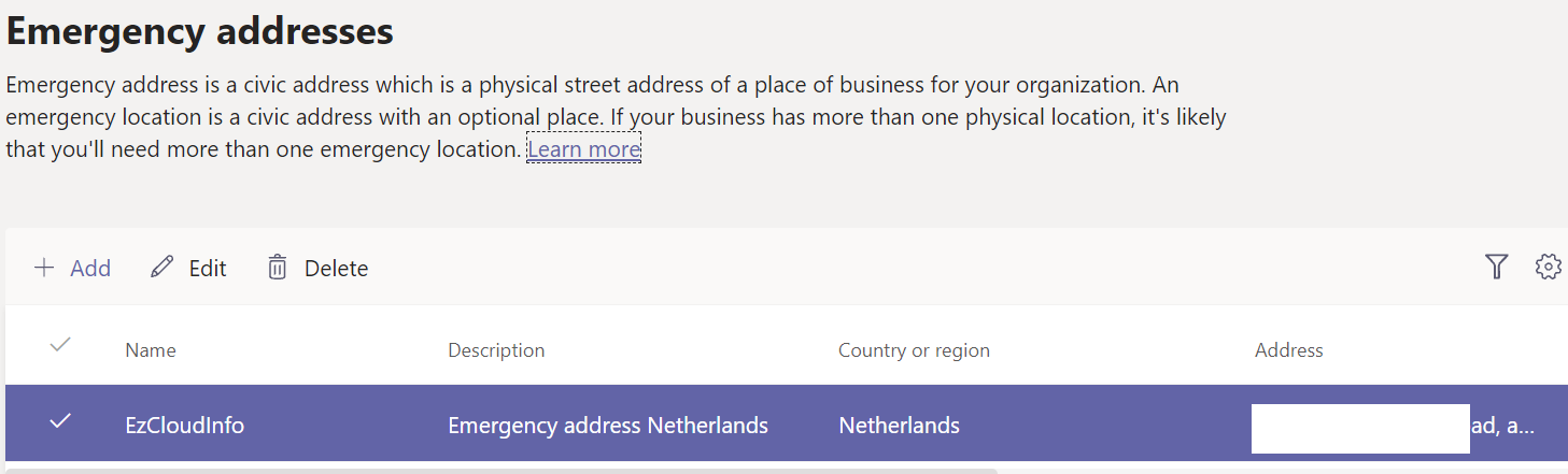In our case we are testing from the location Netherlands and hence we have only Netherlands defined as Emergency address.